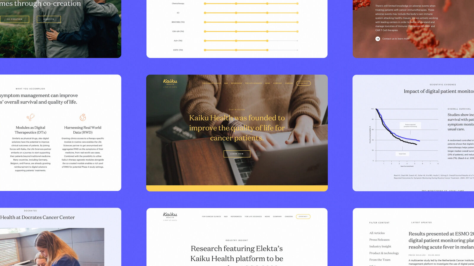We rebranded and built a new website for Kaiku Health, along with collateral and a design system, to improve the user experience of their cancer care application.